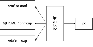 The LPRng client applications lpr, lprm, lpq, and lpc use the /etc/lpd.conf, /etc/printcap and ${HOME}/.printap files (if they exist) (Figure 1-6). The values in the ${HOME}/.printcap file are used to override the values in the /etc/printcap file, and the first printcap entry in the ${HOME}/.printap file becomes the default printer for the user (see Figure 1-7).