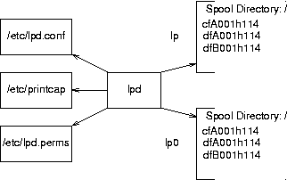 As shown in Figure 1-2, the LPRng print spooler uses the /etc/printcap, /etc/lpd.conf, and /etc/lpd.perms, files to get its operational parameters. The the /etc/printcap file defines a set of spool queues, each of which holds print jobs. The a print job consists of a control file (cfAnnnHHHHHHH) and one or more data files (dfAnnnHHHHHHH dfBnnnHHHHHHH, etc); the control file contains information such as the user name, file names, and printing options, while the data files contain the data to be printed.