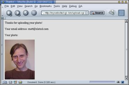 But how does it work? In this article I'm going to talk you through the process of file upload, and show you how to build a simple file upload example using CGI and Perl. The example we'll go through will allow people to upload photos of themselves to your Web server.