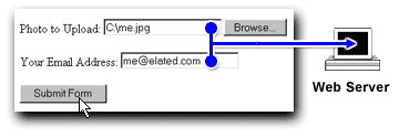 The user clicks the "Browse..." button to bring up the file selector, and chooses the file they wish to upload. Then, when they click the "Submit" button on the form, the file's data is uploaded to the Web server, along with the rest of the form's data: