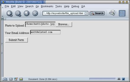 ENCTYPE="multipart/form-data">Note the special multipart/form-data encoding type, which is what we use for file upload. Note also that the form will post the data to our upload script, called