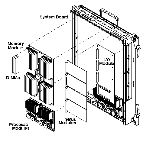 If an UltraSPARC module, DIMM, SBus board, memory module, I/O module, system board, control board, centerplane support board, power supply, or fan fails -- the system attempts to recover without any service interruption. Later, the failed component can be hot swapped out of the system, and can be replaced while the system is still on line.
