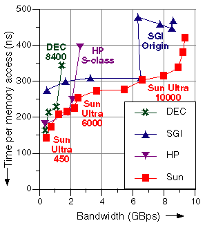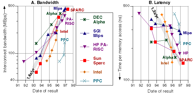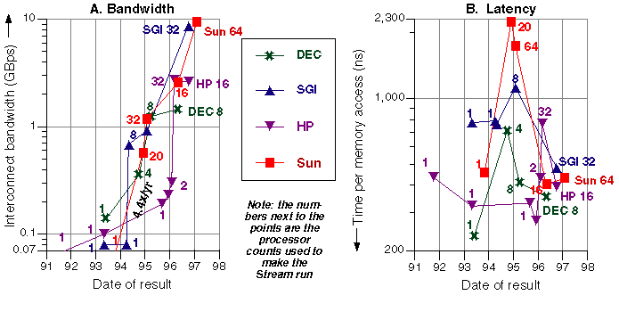 The latencies in Figure 2B show an interesting trend. The initial multiprocessor results from each vendor (circa 1995) show an upward jump in latency, reflecting the difficulties of interconnecting many cache-coherent processors. The second-generation SMP results (circa 1997) show major improvement in latencies. Newer processors can keep more cache misses outstanding, newer systems use routers to provide greater bandwidth, and interconnect protocols have been streamlined.
