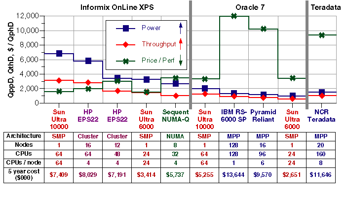 Figure 10 shows all ten of the 300 GB results [18] as of this writing. By sorting the results by database vendor, we can examine the performance of different system architectures running the same database software. Currently, Informix makes the best TPC-D performance, but as with most benchmarks, the vendor leap-frogging will continue.