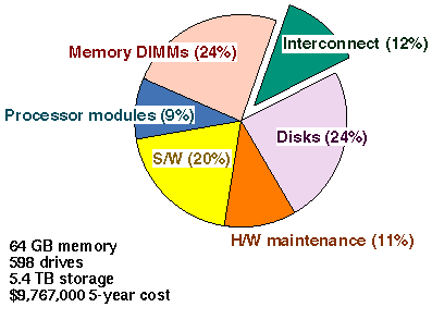 Figure 11 shows that system interconnect cost only 12% of the five-year cost-of-ownership for Starfire's 1 TB configuration. The interconnect cost includes everything inside the system cabinet except the processor modules and the DIMMs.