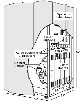 Besides the card cage, power, and cooling, the cabinet has room for three disk trays. The rest of the peripherals are housed separately in standard Sun peripheral racks.