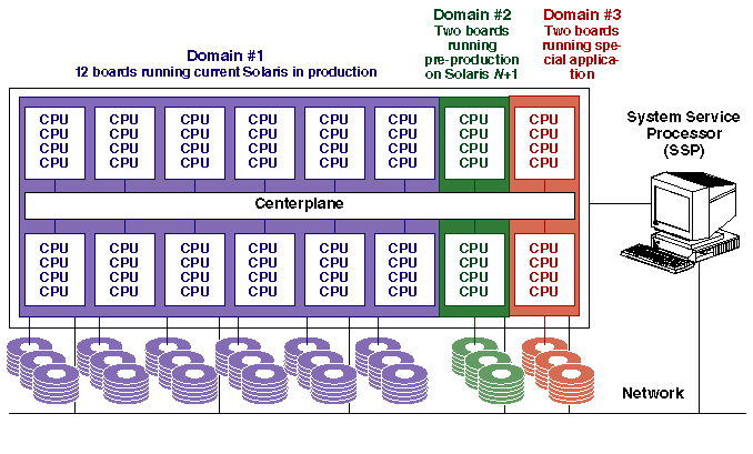 System domains are configured to have their own disk storage and networking. Administration of each system domain is done from the System Service Processor (SSP) that services all the domains. The system administrator may create domains dynamically without impacting work in progress on the system.