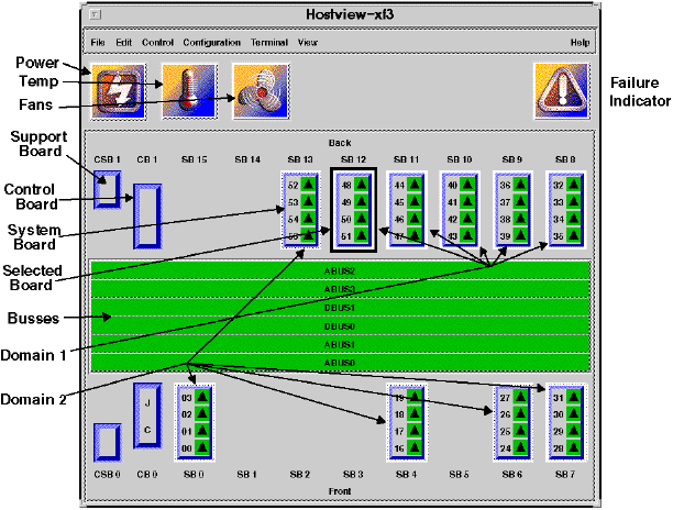 The System Service Processor (SSP) is a SPARC workstation that runs standard Solaris plus a suite of diagnostics and management programs. These include Power-On Self-Test (POST), hostview, and Network Console utilities developed for the Starfire system. The SSP enables the operator to monitor and control the system. Figure 7 shows the Starfire hardware and domain status in hostview's main screen.