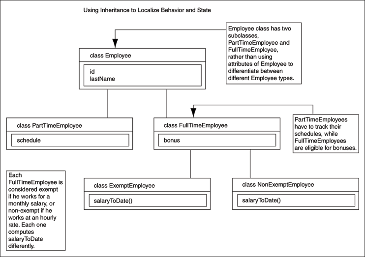 In addition, you can create a Contractor class that does not inherit properties from Employee and implements a compensationToDate() method in it. A program that calculates total payroll to date would iterate over all people on payroll, regardless of whether they were full-time or part-time employees or contractors, and add up the values returned from calling the compensationToDate() method on each. You can safely make changes to the individual compensationToDate() methods or the classes, and know that callers of the methods will work correctly.