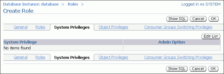 In the Available System Privileges list, double-click privileges to add them to the Selected System Privileges list. The privileges to add are listed in table Table 7-2.