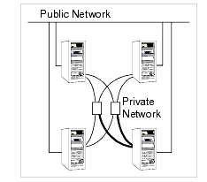 1. Connect the VCS private Ethernet controllers. If you are expanding from a two-system cluster, you need to use independent hubs for the private network connections, replacing crossover cables if they are used. If you already use independent hubs, connect the two Ethernet controllers on the new system to the independent hubs. The following illustration shows a new system being added to an existing three-system cluster using two independent hubs.