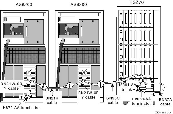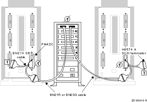 Figure 6-5 shows a configuration consisting of two systems and one HSZ40 DEC RAID controller, all differential devices. There is one shared differential SCSI bus between the terminated H885 trilink connector and terminated BN21W-0B Y cable.