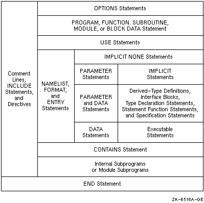 Figure 2-1 shows the required order of statements in a Fortran program unit. In this figure, vertical lines separate statement types that can be interspersed. For example, you can intersperse DATA statements with executable constructs.