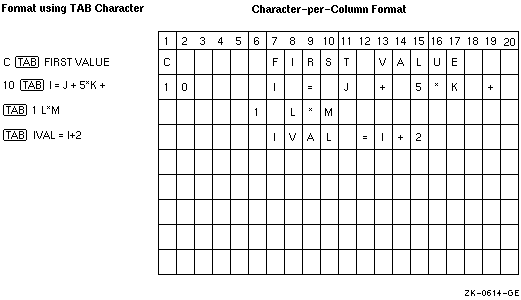 Figure 2-2 shows equivalent source lines coded with tab and fixed source form.
