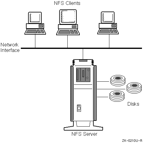 Figure 1-1 shows a typical NFS environment: one server supporting several clients connected by the Ethernet. The server manages the shared resources, such as data files and applications, and is responsible for the multiplexing of its resources among the various clients. The server also must maintain and protect the data within these shared resources.