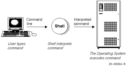Figure 1-1 shows the relationship between the user, the shell, and the operating system. The shell interacts with both the user to interpret commands and with the operating system to request command execution.