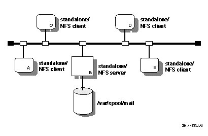 Figure 11-1 shows a sample standalone configuration on a LAN in which all hosts are configured as mail standalone systems. Host B is also an NFS server, exporting the /var/spool/mail directory to hosts A, C, D, and E. Hosts A, C, D, and E are also NFS clients, importing the /var/spool/mail directory from host B.