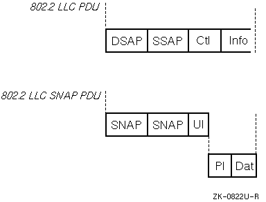 Figure E-5 illustrates the 802.2 LLC PDU and the 802.2 LLC SNAP PDU. One of these two structures is contained within the 802.3 and FDDI frame formats.