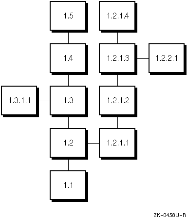 A version identification number is applied to a particular revision of the version control file. In SCCS, this number is called an SID. The identification number for SCCS can contain up to four elements; RCS provides for additional elements. The first two elements are the release number and the level number within that release, and the third and fourth represent the same items of information (called the branch and the sequence) for a branched version of the file. (See Section 6.3.) Release identification numbers begin at 1. Level identification numbers within a release begin at .1 and advance by .1, so that the first version of a file is 1.1, the second version is 1.2, and so on. Figure 6-4 (in Section 6.3) illustrates the numbering sequence for one file's deltas.