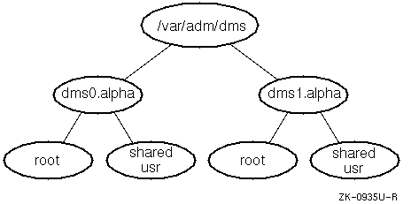 Figure 9-2 shows the /var/adm/dms portion of a DMS area, it contains two DMS environments, dms0.alpha and dms1.alpha. Each DMS environment contains a root and /usr file system. The root file system is copied to each client system. The /usr file system is read only and is shared among all client systems registered to the environment.