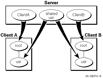In the DMS area, the server maintains multiple copies of the root area, one for each client. Each copy is in a client root directory in the DMS area and is customized for the client in order to provide for differences between hardware platforms or environmental requirements. Each of the client root directories is private; this means that there is a directory for each client so that no conflict or confusion exists between clients. The server's DMS root and /usr areas are made available to clients by means of the Network File System (NFS). For more information about the NFS used by Digital UNIX systems, refer to the Network Administration guide.