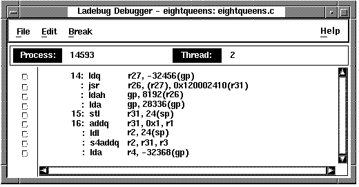 A breakpoint with no condition associated with it can be set by using the Break menu, but it is often simpler to click on the toggle push button in the source display.