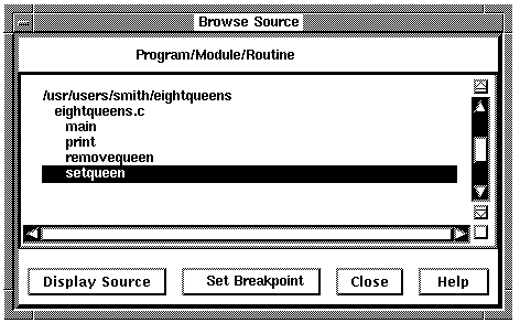 The Browse Source dialog box displays information in a hierarchical form about all the binary files in your application. For each binary file, it displays information about the modules contained in the binary. For each module, a list of routines in that module can be displayed.
