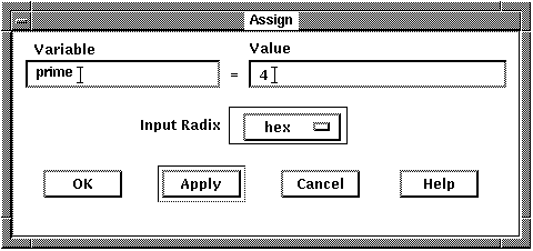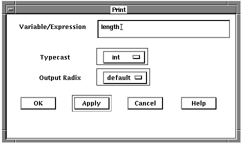 3. Enter the debugger command for that push button in the Command field (see Section 4.9.3.1). The command up was chosen. This command interprets an entity selected in a window as a zero-terminated ASCII string.