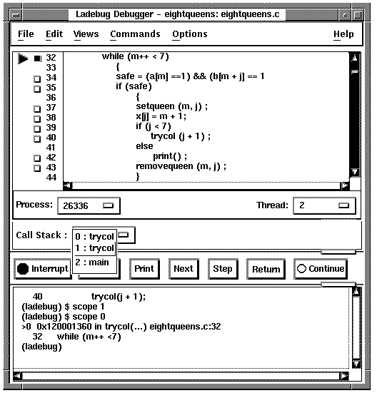 1. To list the sequence of routine calls that are currently active on the call stack, click on the Call Stack menu. Level 0 denotes the routine in which execution is paused, level 1 denotes the calling routine, and so on.