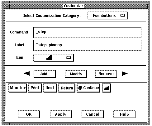 • Modify, add, remove, or resequence push buttons and the associated debugger command.