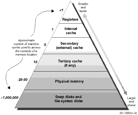 When programs are executed, the system moves data and instructions among various caches, physical memory, and disk swap space. Accessing the data and instructions occurs at different speeds, depending on the location. Table 4-1 describes the various hardware resources (in the order of fastest to slowest access time).