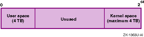 For each process, the virtual memory subsystem allocates a large amount of virtual address space but uses only part of this space. Only 4 TB is allocated for user space. User space is generally private and maps to a nonshared physical page. An additional 4 TB of virtual address space is used for kernel space. Kernel space usually maps to shared physical pages. The remaining space is not used for any purpose.