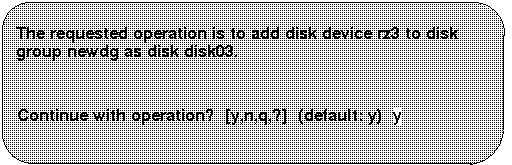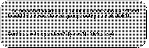 If you are sure that the disk partition has no valid data and that the partition can be added to LSM, you can ignore the warning message and answer y to the prompt. The voldiskadm utility then proceeds to initialize the disk partition and add it to LSM.