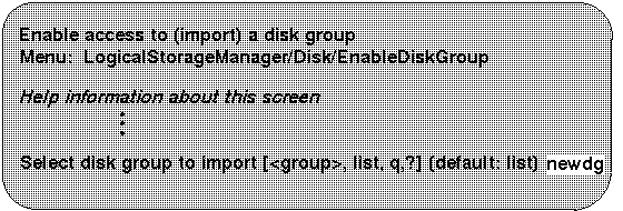 Use this menu operation to enable access by this system to a disk group. This operation can be used to move a disk group from one system to another. If you want to move a disk group from one system to another you must first disable (deport) it on the original system (see Section 9.3.2), then move the disk between systems and enable (import) the disk group.