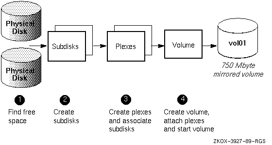 When you specify to LSM what is needed (for example, a 750MB, mirrored volume), LSM does the following: