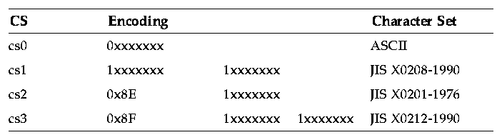 The EUC for Japanese consists of single-byte and multibyte characters (2 and 3 bytes). The encoding conforms to ISO2022 and is based on JIS and EUC definitions, see Table 3-3.