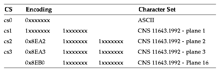 The EUC for Traditional Chinese is an encoding consisting of characters that contain single-byte and multibyte (2 and 4 bytes) characters. The EUC encoding conforms to ISO2022 and is based on the Chinese National Standard (CNS) as defined by the Republic of China and the EUC definition, see Table 3-4.