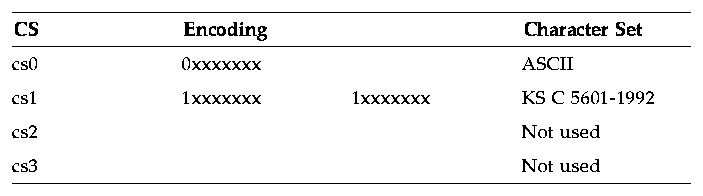 The EUC for Korean is an encoding consisting of single-byte and multibyte characters (shown in Table 3-6). The encoding conforms to ISO2022 and is based on Korean Standard Code (KSC) set and EUC definitions.