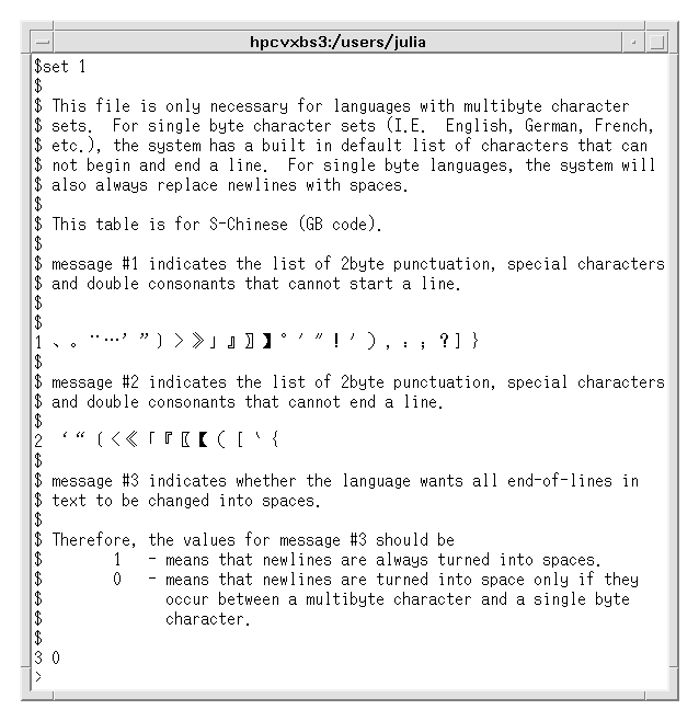 A multibyte language, such as Japanese or Chinese, requires a formatting table. This table contains three message sets. The first set consists of characters that cannot start a line; the second set lists any characters that cannot end a line; and the third set indicates how to handle newline characters that occur between a single-byte and a multibyte character.