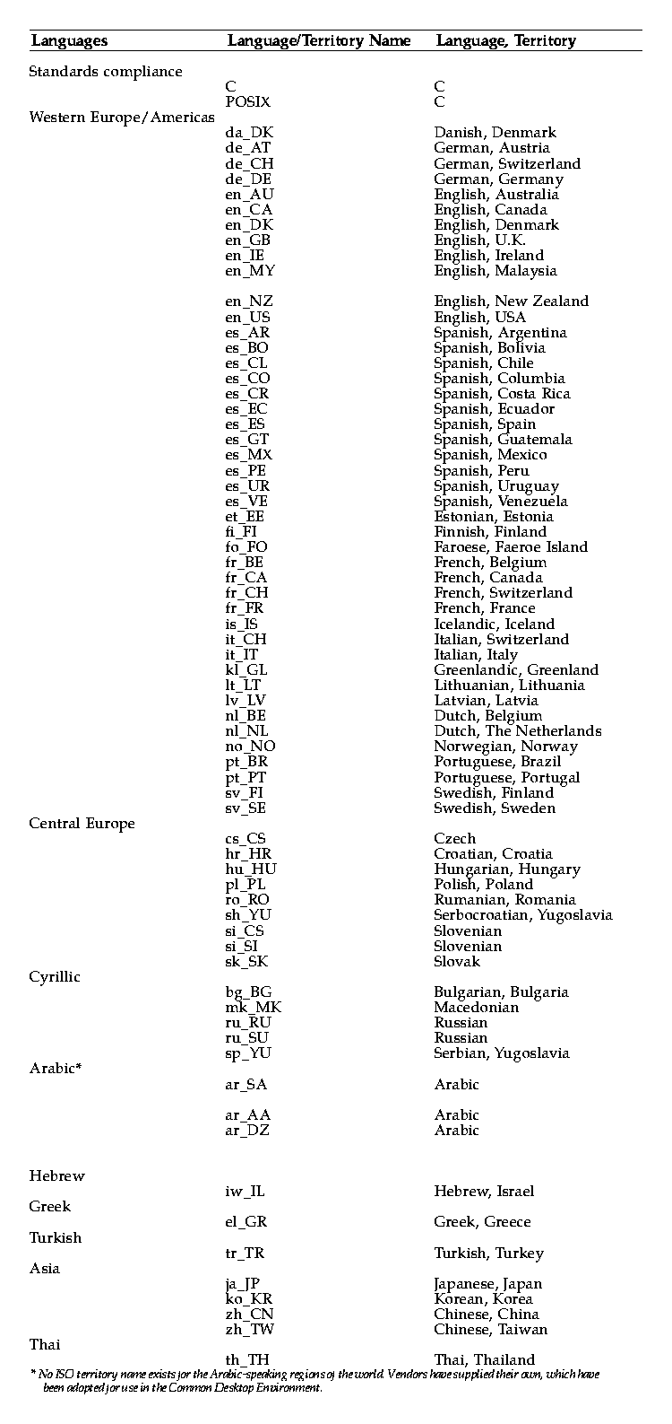 The language and territory names supported by the Help System are listed in the following table. Before you choose a language, refer to your system documentation to identify the languages and character sets supported on your platform.