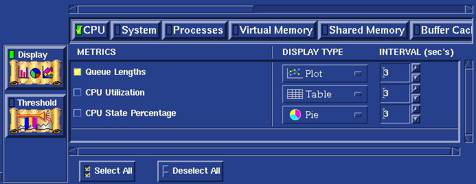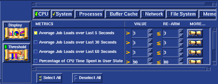 The Display and Threshold buttons each have a specific work area, showing related categories, metrics, and options.