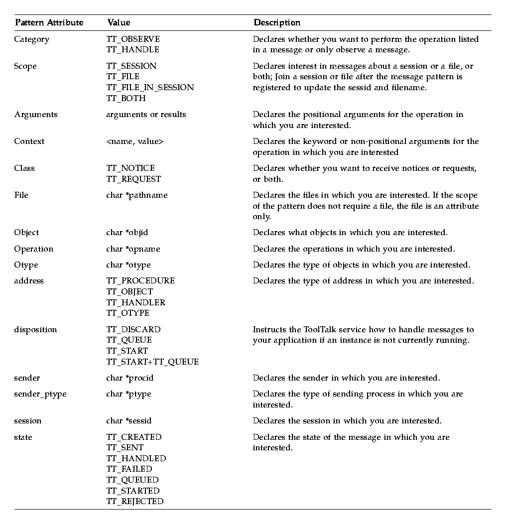 - If there are multiple values specified for a pattern attribute, one of the values must match the message attribute value. If no value matches, the ToolTalk service will not consider your application as a receiver.