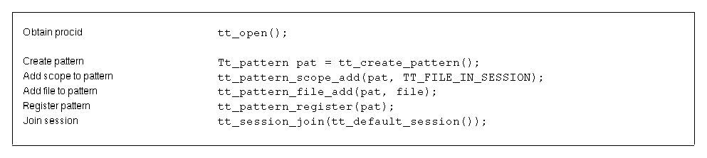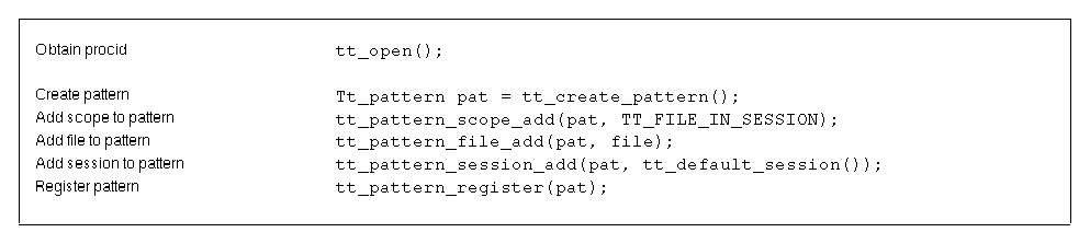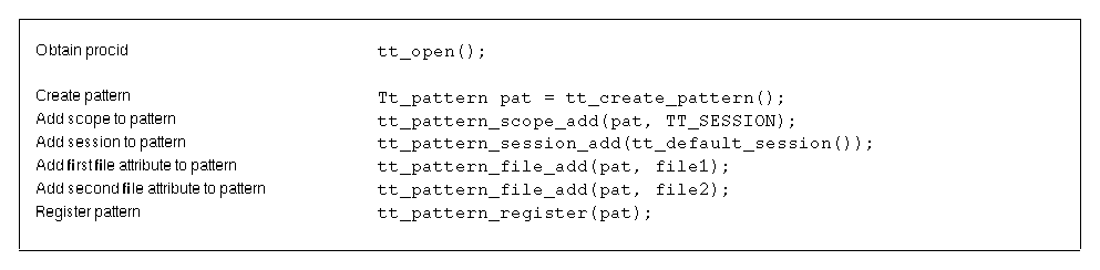 To match TT_SESSION-scoped messages and TT_SESSION-scoped patterns that have the same file attributes, you can add file attributes to TT_SESSION-scoped patterns with the tt_pattern_file_add call, as shown in Code Example 3-10.
