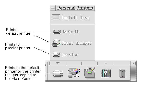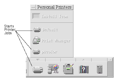 Your system may have more than one printer that you can use for printing. One of the printers will be designated as the default printer. The default printer is the printer that your desktop automatically uses if you submit a document for printing and you don't specify a printer name. When you first open your desktop, the default printer is shown in the Front Panel.